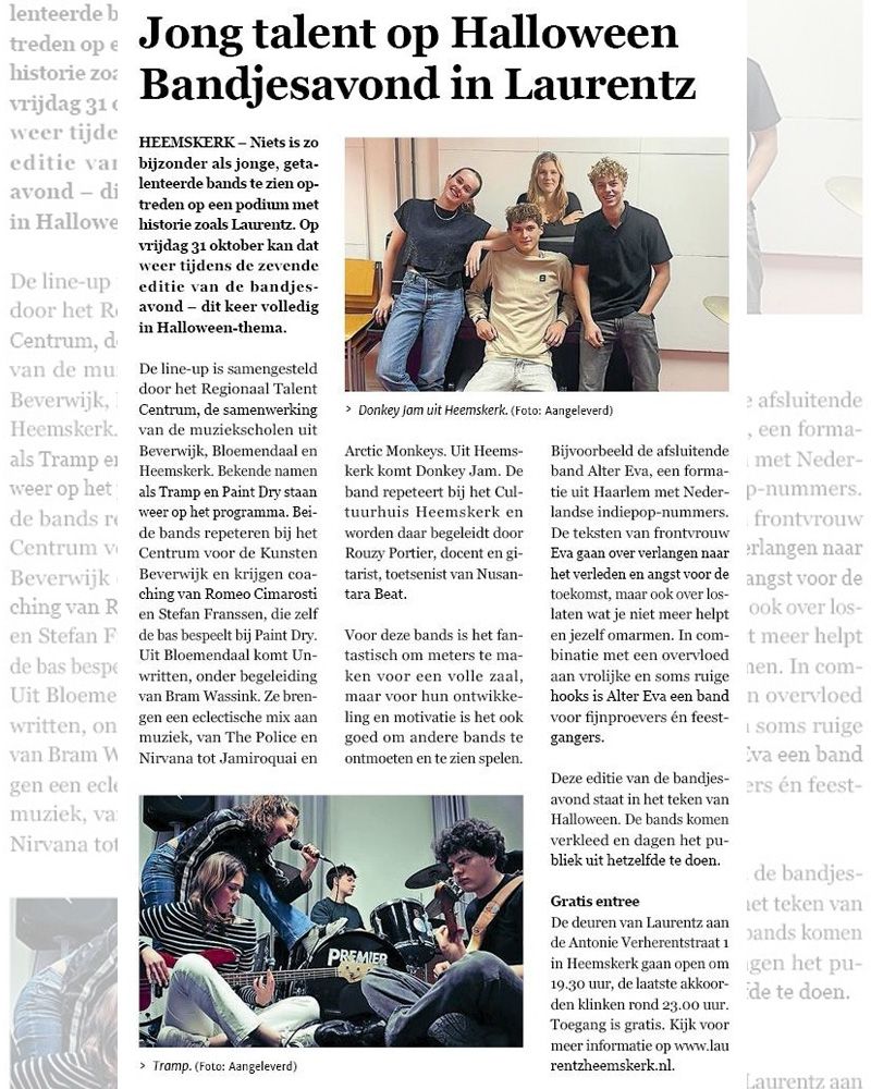Op 20 maart gaat het dak er weer af in Laurentz. Vijf bands, geselecteerd door de bandcoaches van de samenwerkende muziekscholen en de programmeur van Laurentz, betreden weer het podium voor een spet…